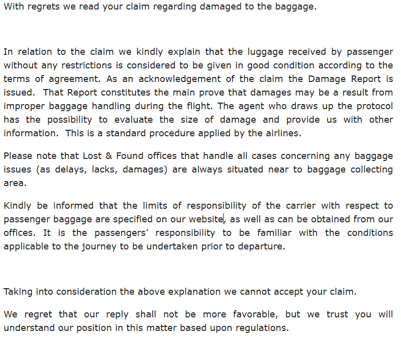 「お客様が受け取った時点で手荷物に異常がないと申し出なかった場合、手荷物は“良好な状態で返却された”とみなされます。