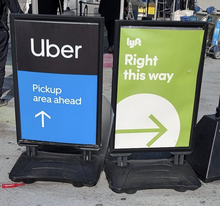 バスを降りると、そこは巨大な駐車場のようなスペース。 「Taxi」「Uber」「Lyft」と看板が出ているので、自分の使いたいサービスのエリアに向かいましょう。